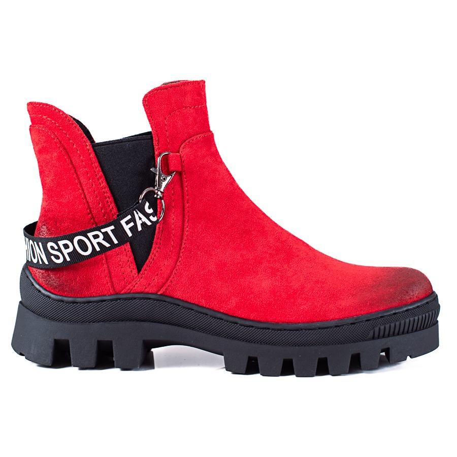A piros szín és a fekete talp kombinációja tökéletesen illeszkedik a hétköznapi és rock stílusba. Megfelel azoknak a nőknek az igényeinek, akik eredeti akcentusokat keresnek a mindennapi stílusban. A felépített, merevített sarokkal és kerek orrral felszerelt csizma stabilitást és kényelmet biztosít. A 3 cm magas lapos sarok és a 2 cm-es platform tökéletes mindennapi viseletet biztosít.
