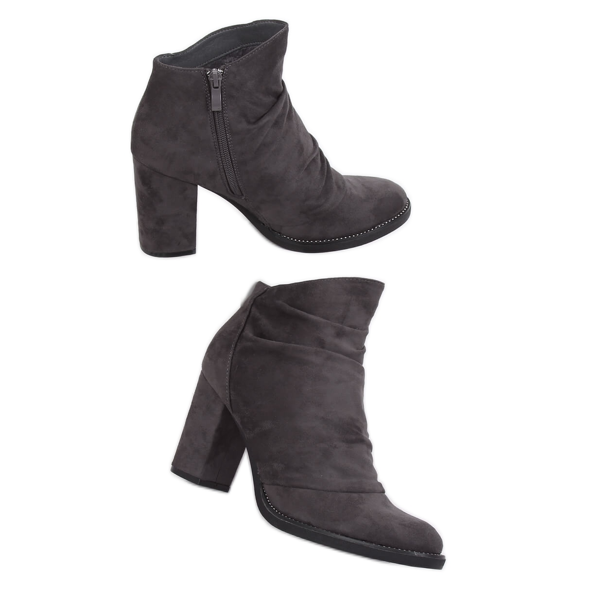 Fedezze fel az eleganciát és a kényelmet a Puebla Grey magas sarkú, szürke árnyalatú bokacsizmával. Ez az egyedi női bokacsizma, stabil, 9 cm magas sarokra szerelve ötvözi a klasszikus dizájnt a legújabb trendekkel. Jellegzetes elemük a fodros felsőrész, amely divatos megjelenést kölcsönöz nekik, a dekoratív szegélyben található finom strasszok pedig egyedi fényt adnak nekik.