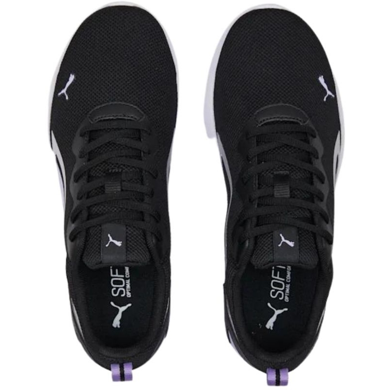-Modell: PUMA egész napos aktív cipő 386269-ben. A 386269 11 változat fekete színben történik, lila akcentussal (fekete és lila változat).