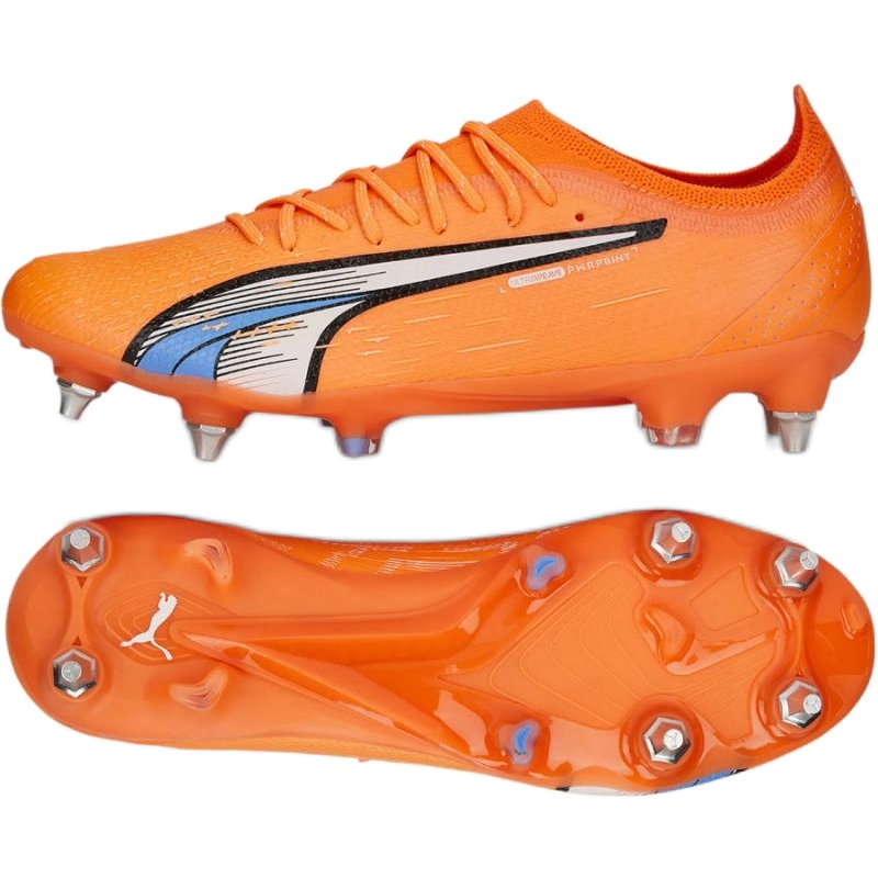 Puma Ultra Ultimate MXSG M 107212 01 cipő - Dinamikus forgalmi dugók narancssárga és piros árnyalatban, egy gyors, agresszív játékhoz tervezték a természetes pályán. Az alacsony, könnyű és néhány illeszkedés lehetővé teszi, hogy a golyó irányítására és a gyorsulásra összpontosítson az egyes műveletek során.