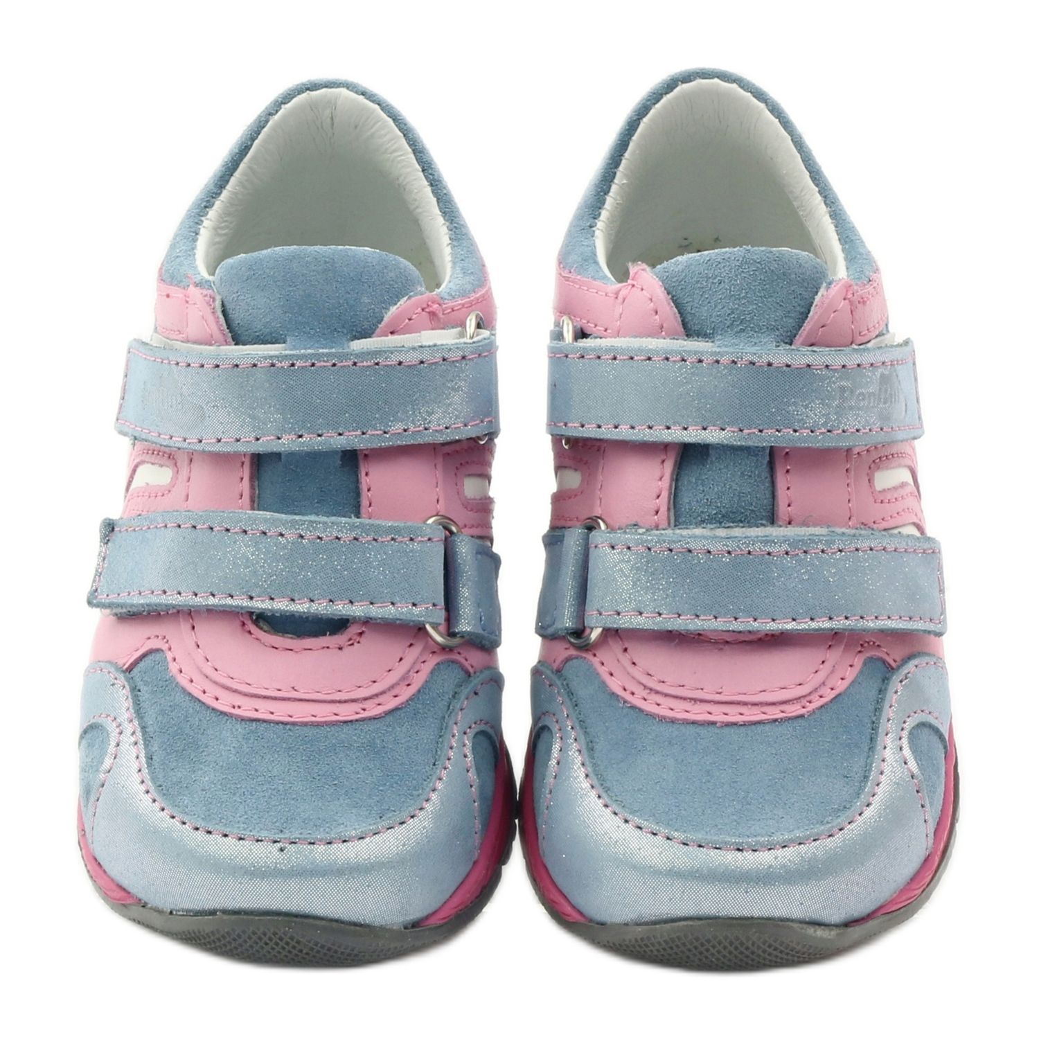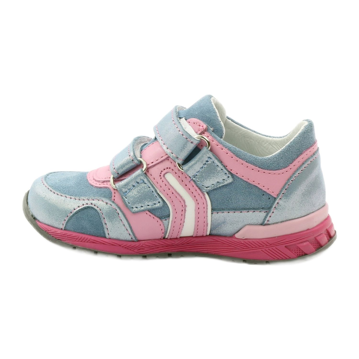 Stílusos és kényelmes cipő lányoknak, mely a finom, pasztell színeket funkcionális megoldásokkal ötvözi. A felsőrész puha, természetes bőrből készült, kék, világos rózsaszín és fehér árnyalatokban, fényes díszítéssel. A két széles, kék tépőzáras pánt megkönnyíti a cipő felvitelét és pontos beállítását a lábfejhez, a merev sarok pedig megfelelő stabilitást biztosít járás közben.