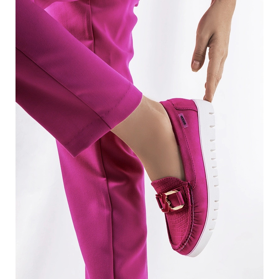 CAMPINI - A platformon lévő rózsaszín lokcsok (Fuchsia) a tökéletes választás a nyári napokhoz, amikor frissesség és nőies karakter stílusát szeretné hozzáadni. Finom préselés egy krokodil motívumban és egy dekoratív arany láncban/csatban elegáns, de könnyű megjelenésű. A természetes bőrből készült betét kényelmet és jól illeszkedik a nap folyamán, és a 3 cm -es platformon lévő fehér gumi talp könnyűséget és divatos figurát ad.