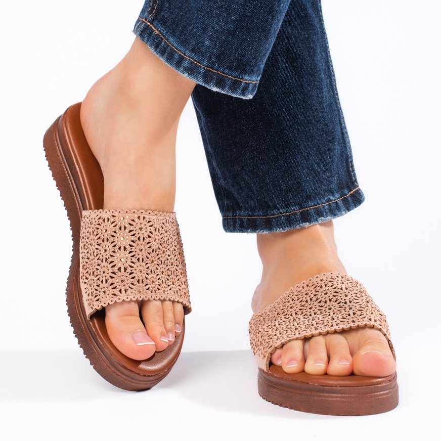 4 cm magas platformjával ezek a papucsok nem csak stílusosnak tűnnek, hanem megfelelő fogást és kényelmet is biztosítanak. A sima barna műanyag talp ellentétben áll a felsőrész finom rózsaszínével, harmonikus egészet alkotva. Ezenkívül az ökológiai bőrből készült talpbetét maximális kényelmet garantál a használat során.