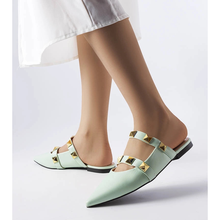 Elegáns, csúszás -Ruckman papucson, megkülönböztetett, hegyes orrú papucsban. Építve -az elülső és az oldalán, a sarok és a metatarsus kivágásaival, egy lapos talpra szerelve (sarok/peron kb. 1 cm, teljes magasság kb. 2 cm). Két csíkkal díszítve, arany színű fémcsapokkal, amelyek divatos, enyhén sziklafigurát hoznak létre. Gyártó színe: zöld; Fekete talp.
