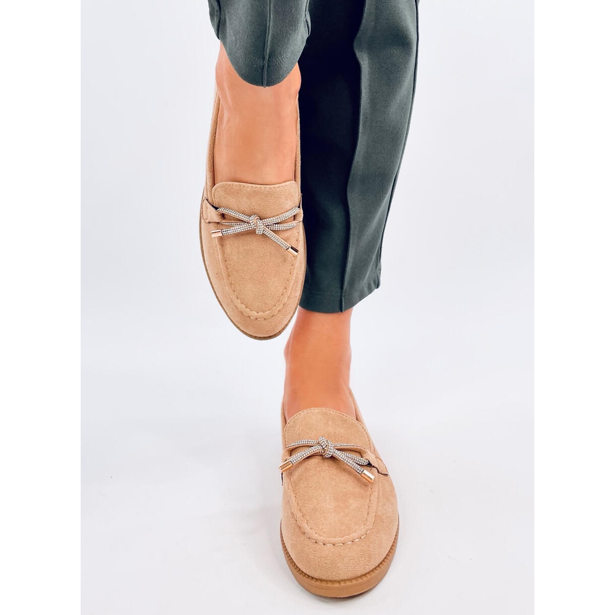 Kiváló minőségű ökológiai velúrból készült, a cipők nemcsak esztétikai megjelenést kínálnak, hanem a környezet iránti aggodalmat is. A 2 cm magasságú, lapos sarok minden lépésnél kényelmet biztosít, és a beillesztett vágás megkönnyíti a cipő felhelyezését és eltávolítását. A puha ökológiai bőr belseje a nap folyamán garantálja a kényelmet, és a cirkon formájában a finom dekorációk egyedi varázst adnak nekik.