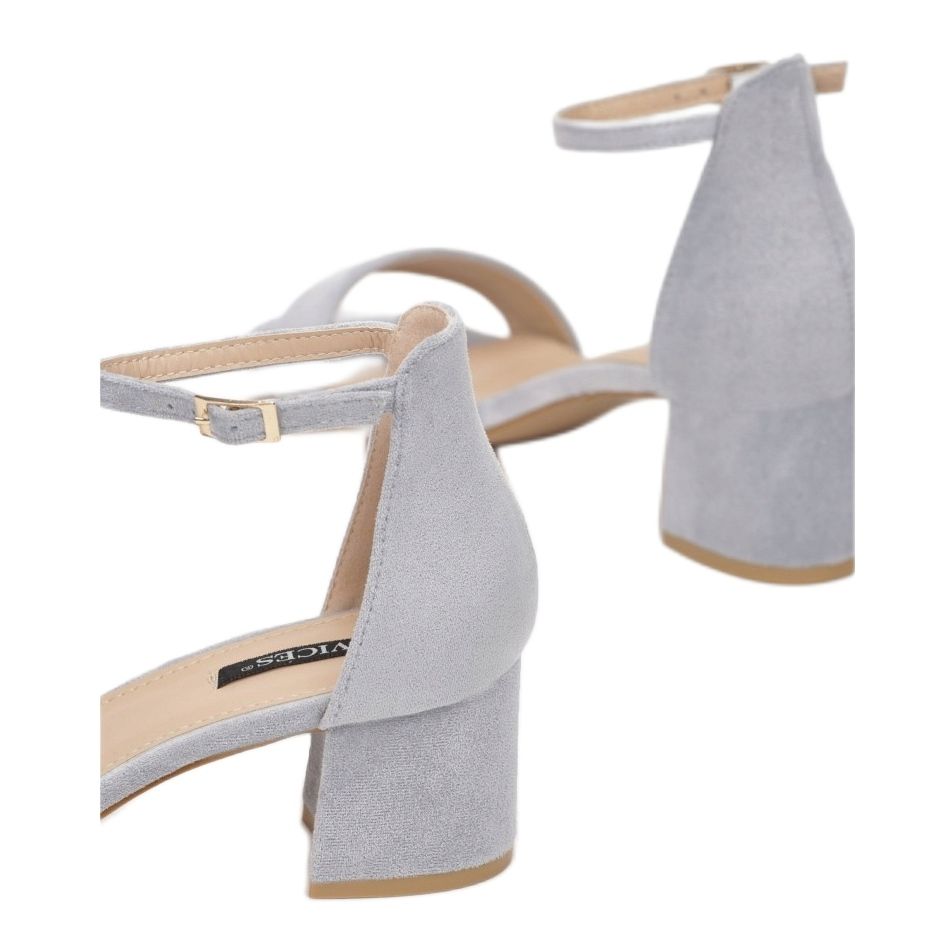 Stabil, 5 centiméter magas, blokkszerű sarok jellemzi őket, amely biztosítja a kényelmet a hosszú távú járás során. A lábujjszinten széles, puha velúrból készült pánt hatékonyan tartja a lábat, így a szandál tökéletes a nyári napokra.
