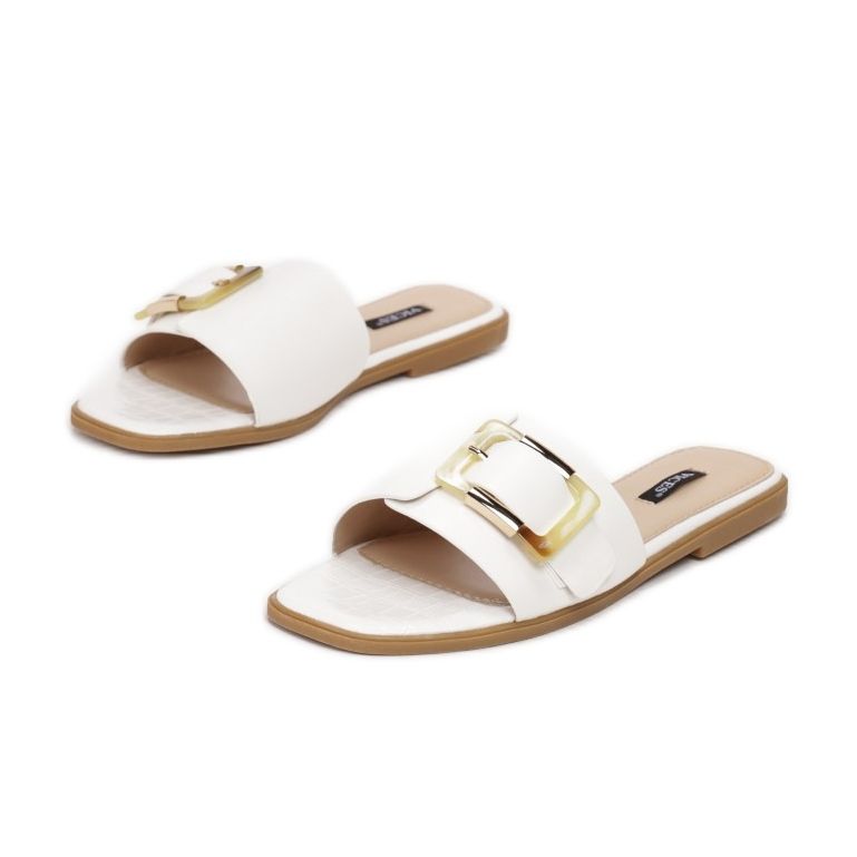Bemutatjuk a női Vices 7356-71 papucsokat a fehér és az arany elegáns kombinációjában, tökéletes a mindennapi stílushoz. Ezek az egyedi lapos szandálok felcsúsznak a kényelem és a gyors felhelyezés érdekében. Elöl széles, nagy csattal díszített pánt karakterességet és divatos akcentust kölcsönöz a cipőnek.