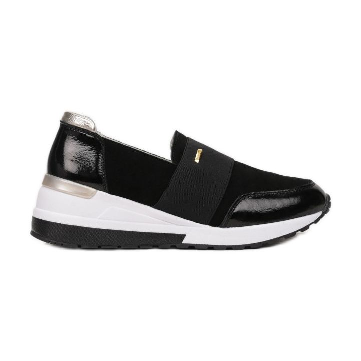 A cipő külső rétege kiváló minőségű velúrból és ökológiai bőrből készült, amely eleganciát és modern karaktert ad. A lakkozott betétek formájában megjelenő további részletek hangsúlyozzák egyedi stílusukat. Belsejében természetes bőr betét található, amely hosszú ideig biztosítja a kényelmes viseletet.