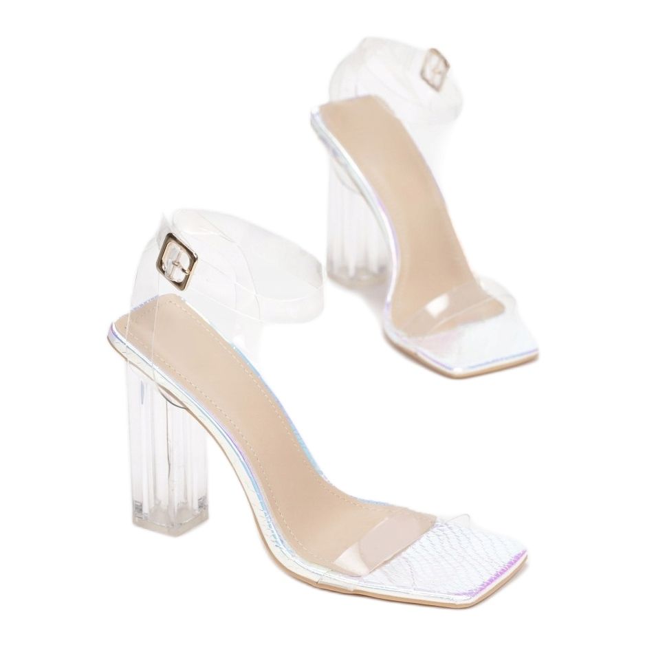 Ezt a modellt a bokát, a lábujjakat és a láb középső részét körülvevő átlátszó elemek jellemzik, amelyek könnyedséget és eredetiséget adnak. A 10,5 cm magas, geometrikus oszlop tökéletes sziluettet biztosít, miközben stabilizálja a járást. A csatos zárás megkönnyíti a fel- és levételt, a szögletes orr pedig lehetővé teszi az ujjak szabad mozgatását.