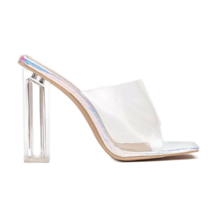 A magas, 11 centiméteres oszlop négyzet alakú alappal stílust ad, és minden sziluettet fenomenálisvá varázsol. Az elöl elhelyezett széles pánt hatékonyan támogatja az ujjakat, biztosítva a stabilitást járás közben. A sarokban és a pántban használt átlátszó anyagok a szeretett könnyedséget és modern megjelenést kölcsönzik.