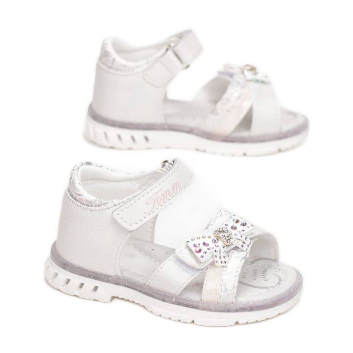 A kényelem a T9225 kulcsfontosságú jellemzője. A merev sarokpult és a bőrbetét gondoskodik a kényelmes viseletről, a praktikus tépőzáras rögzítők pedig megkönnyítik a szandálok fel- és levételét. A kiegészítő díszítések - holo hatású csíkok és fényes cirkóniutánzatok - teszik igazán egyedivé ezt a modellt. A szandálokat egy bájos masni alakú betét is díszíti, ami a lábbeli lányos jellegét hangsúlyozza.