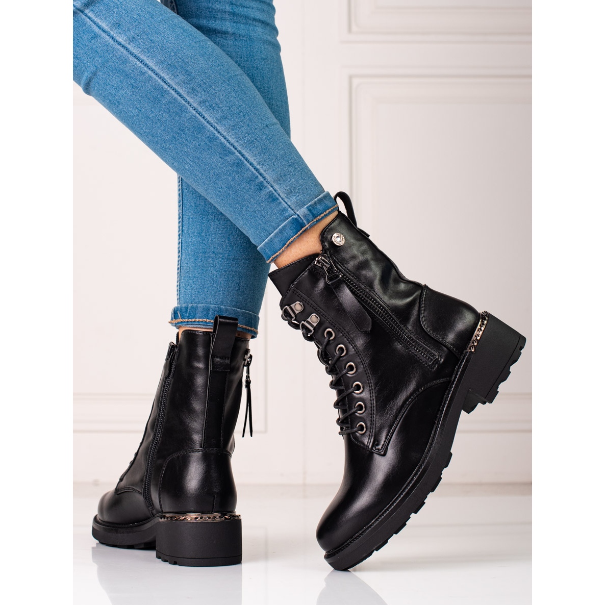 Fedezze fel az őszi/téli szezon legújabb lábbelitrendjét a Shelovet női fűzős csizmával, klasszikus fekete színben. Ez a stílusos bokacsizma kiváló minőségű ökológiai bőrből készült, így nem csak divatos akcentussá, hanem környezetbarát választássá is válik. A beépített, merevített saroknak köszönhetően a lábad kényelmes és stabil lesz.