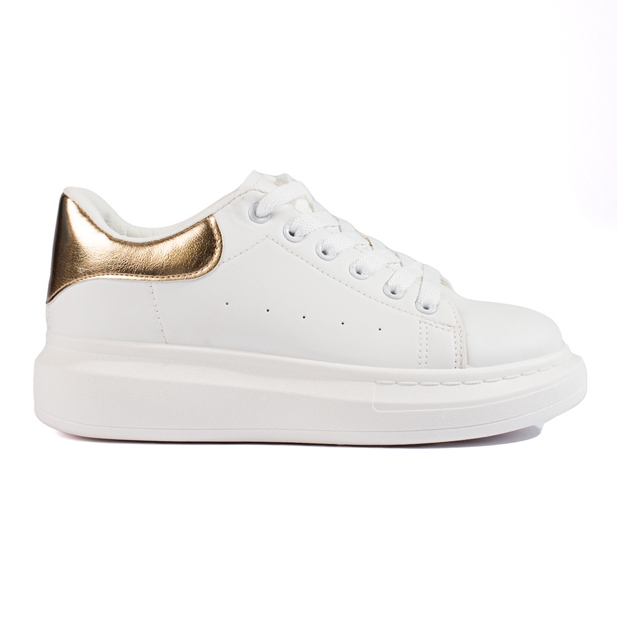 A Shelovet fehér női sportcipőknek nincs sarka, és egy felépített és puha sarok jellemzi őket, amely stabilitást biztosít járás közben. A gumitalp csúszásgátló tulajdonságokkal rendelkezik, és kopásálló. Az 5 cm magas platform magabiztos lépést biztosít, ugyanakkor finoman megemeli a figurát.