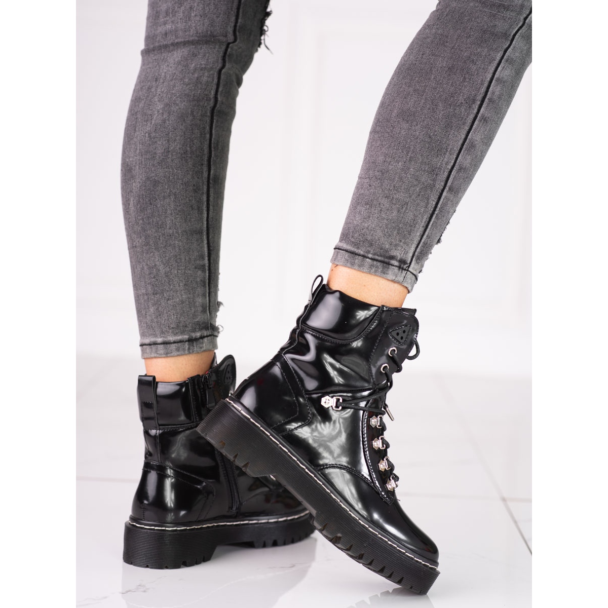 Az elegáns fekete színű, fűzős Shelovet női táskák minden eredeti lábbelit kedvelőnek kötelező darabok. Ez a stílusos csizma tökéletes mindennapi használatra, hétköznapi és rock stílusban, tökéletesen passzolva az őszi és téli szezon hangulatához.