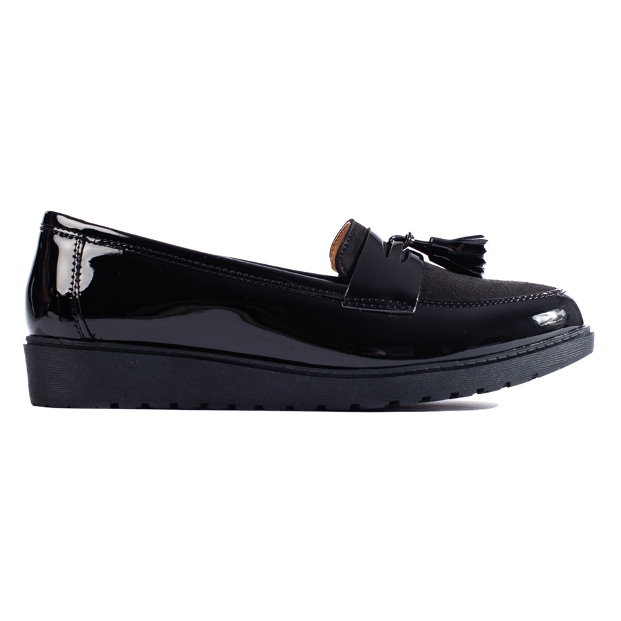 A mokaszinok 4 cm magas platformmal rendelkeznek, amely minden lépésnél kényelmet és magabiztosságot biztosít. Külső rétegük ökológiai lakkbőrből készült, ami nem csak elegáns megjelenésű, hanem tartóssá és könnyen ápolhatóvá is teszi őket. A kerek orr és az elülső rojtok egyedi karaktert adnak a cipőknek, a klasszikus fekete színnek köszönhetően pedig könnyen kombinálható a legkülönfélébb stílusokkal.