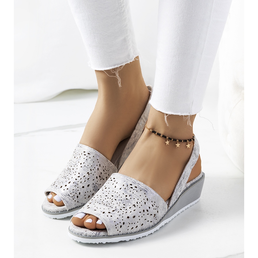 A szandálokat 5 cm magas ék jellemzi, amely nemcsak stílusos megjelenést, de kényelmet is biztosít minden alkalomra. Javasoljuk, hogy nagyobb méretet válasszon, mert a számozás visszafogott. A fehér műanyag talpnak és a talpbetétben lévő természetes bőrnek köszönhetően a szandálok egész napos kényelmet garantálnak.