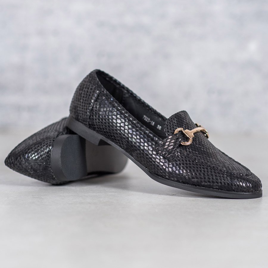 A fekete Snake Print VICES naplopók a tökéletes választás azoknak a nőknek, akik értékelik a divatos megjelenést és a viselési kényelmet. A kiváló minőségű bőrszerű anyagból készült elegáns cipőket egy eredeti, kígyóbőrt utánzó motívum jellemzi, amely egyedi karaktert ad nekik.