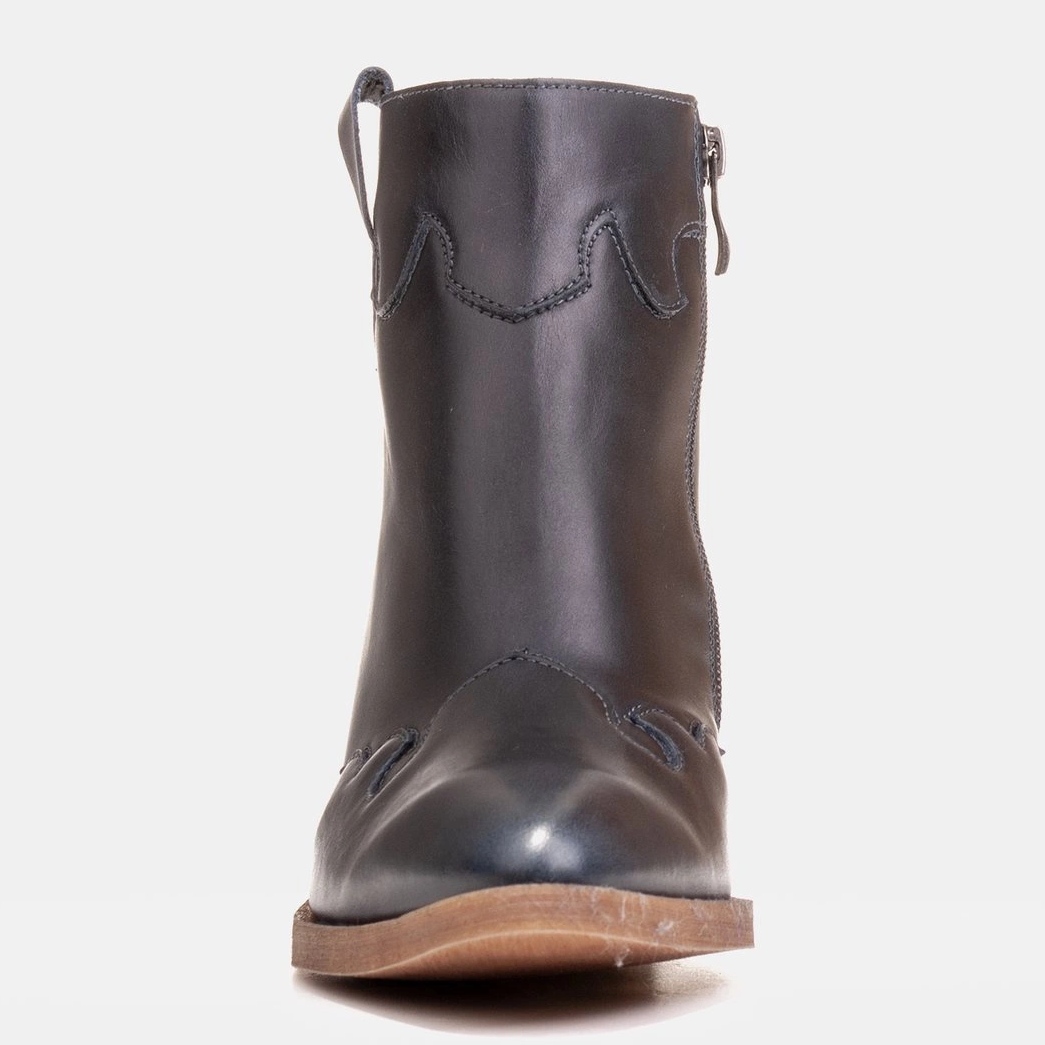 Elegáns női csizma divatos, mély kék árnyalatban. Készülékből készült, klasszikus boka cowboy csizmaként tervezve - stílusos kiegészítés a mindennapi és elegánsabb stilizációkhoz.