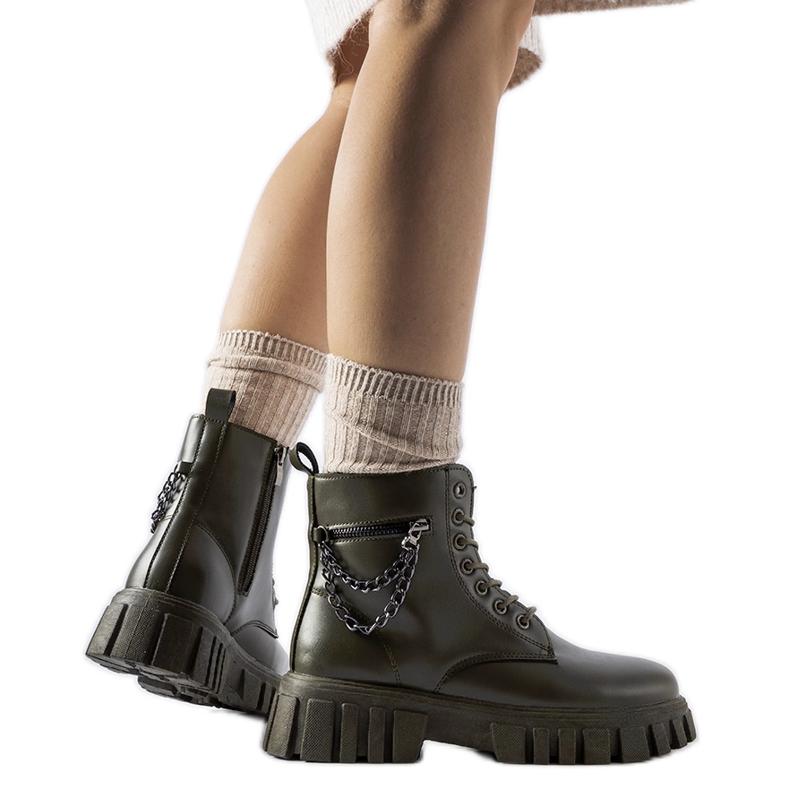 A sötétzöld csizma a kényelem és a divatos formatervezés kombinációja - gyakorlati megoldások (zseb, kastély, lánc) itt találkoznak önkormányzati stílusban.