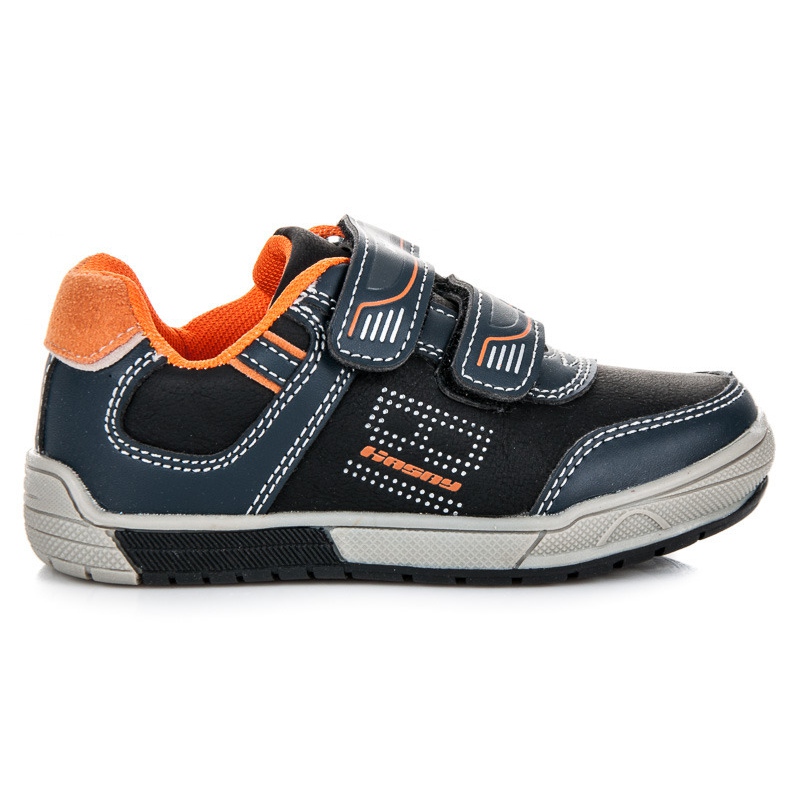 Praktikus és kényelmes gyerekcipő a Hasby-től, ökológiai bőrből, elegáns fekete színben, finom szürke és narancssárgával. Dupla tépőzárral rögzítve, amely megkönnyíti a gyors felhelyezést és biztosítja a láb szilárd tartását - tökéletes mindennapi használatra, iskolába és játszóterekre.
