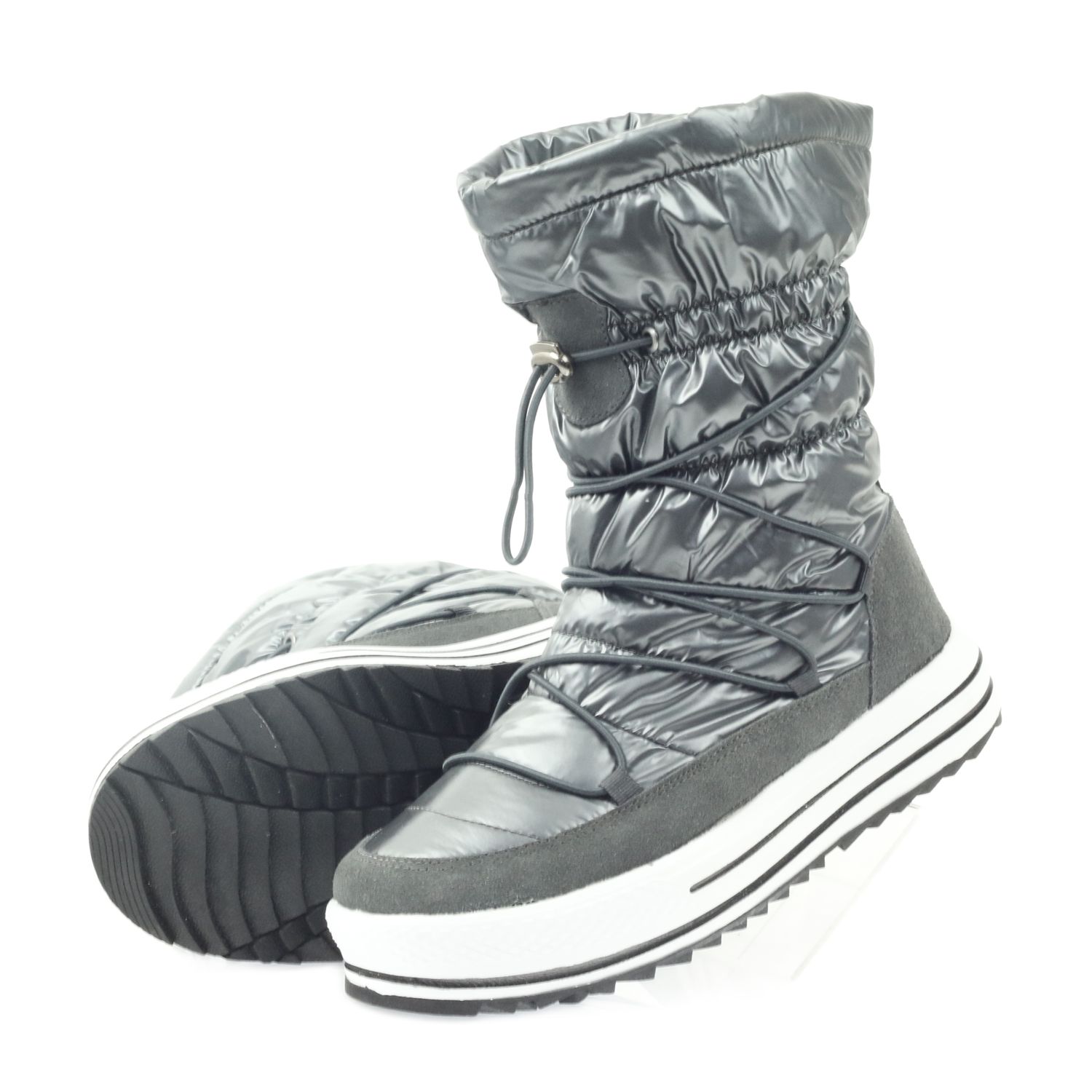 Ezek a hócsizmák kiváló minőségű nylon anyagból készültek, gyönyörű, sötétszürke metálfényezéssel, amely modern karaktert kölcsönöz neki. A cipő belsejét puha, vastagabb fehér szőrzet szigeteli, amely maximális kényelmet és meleget biztosít a leghidegebb napokon is.