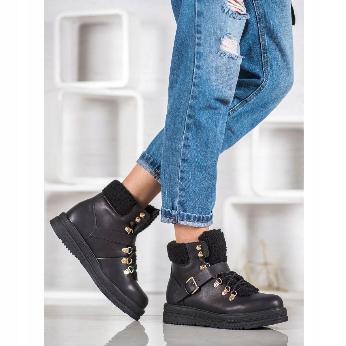 A csizmák fűzősek, aminek köszönhetően tökéletesen a láb formájához igazíthatók, biztosítva a viselési kényelmet. Felsőrészén báránybőr kabáttal és dekoratív csattal rögzítve felhívják magukra a figyelmet és karaktert adnak minden stílusnak. A futófelülettel ellátott talp stabilitást és kényelmet biztosít járás közben, a 3-5 cm-es sarokmagasság pedig megkönnyíti a hosszú távú használatot fáradtság nélkül.