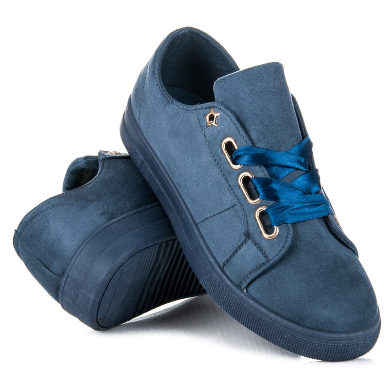 Ideal Shoes Suede Sneakers szalaggal - nőies, kényelmes és divatos modell mindennapi használatra. A kék felsőrész velúr (öko-bőr) bevonattal ötvözi a finom stílust a könnyű karbantartással, a hagyományos csipkék helyett dekoratív szalag pedig finom, divatos karaktert kölcsönöz az egésznek.