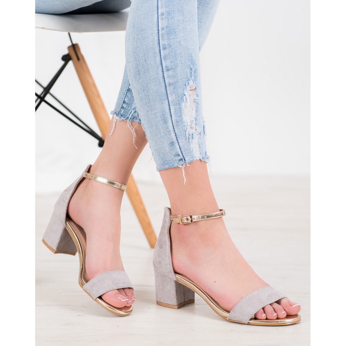 A cipő stabil, 6 centiméteres blokksarokkal rendelkezik, amely kényelmes viseletet biztosít, tökéletes hosszú estékre vagy ünnepségekre. A felsőrész beépített sarokkal és a lábujjak felett velúr pánttal kiemeli a szandál elegáns stílusát. Ezenkívül a sarkát arany pánt díszíti, elegáns csattal, amely egyedi karaktert kölcsönöz nekik.