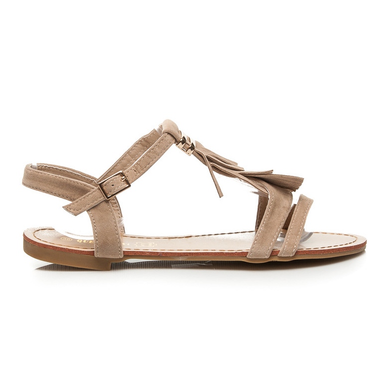 Ezeket a szandálokat három vékony pánt különbözteti meg: kettő támogatja a lábujjakat, és egy praktikus csattal a bokán, amely tökéletes illeszkedést biztosít a lábfejhez. A divatos rojtokkal díszített kiegészítő öv egyedi karaktert ad nekik, illik a bohó stílushoz, amely minden bizonnyal felkelti a figyelmet.