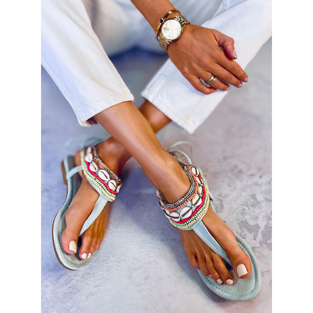 Bemutatjuk a BM gyöngyös szandálokat kék árnyalatban 8241 L.BLUE - tökéletes választás nyárra! Ezek az elegáns, lapos talpú női szandálok a divatos flip-flop stílust ötvözik a kagylók, gyöngyök és cirkóniák formájú egyedi díszítésekkel, amelyek egyedi bájt kölcsönöznek nekik.