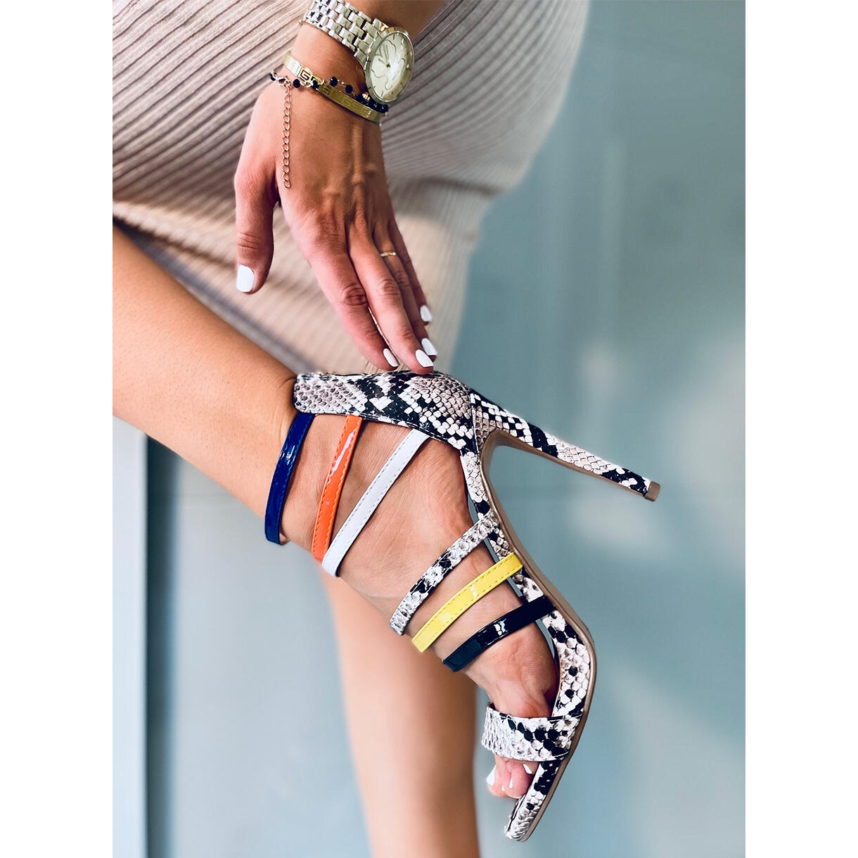 A szandálokat kígyóbőr motívum jellemzi, ami egy kis vadságot és karaktert ad, tökéletesen illeszkedve az aktuális divatirányzatokhoz. A vékony, 11 cm magas tűsarkú optikailag meghosszabbítja a lábakat, így bármilyen stílust elegánsabbá tesz. A hátsó cipzár praktikus részlet, amely megkönnyíti a cipők fel- és levételét.