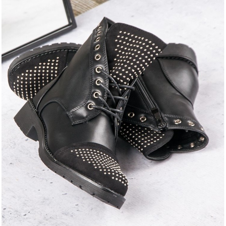 A fekete rock munkásai a tökéletes választás önbizalommal teli nők számára, akik a divatos megjelenést a mindennapi kényelemmel szeretnék ötvözni. A részletekre odafigyeléssel készült bokacsizmát látványos kristályok és strasszok díszítik, amelyek egyedi karaktert adnak nekik.