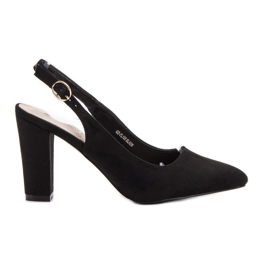 A nyitott sarokkal rendelkező, fekete színű Goodin pumpák a tökéletes választás azoknak a nőknek, akik értékelik az eleganciát és a kényelmet. A kiváló minőségű öko-velúrból készült cipők a klasszikus dizájnt modern díszítéssel ötvözik. A 9,5 cm magas, blokk formájú sarok stabilitást és kényelmet biztosít viselés közben, így mindennapi használatra és különleges alkalmakra egyaránt tökéletes.