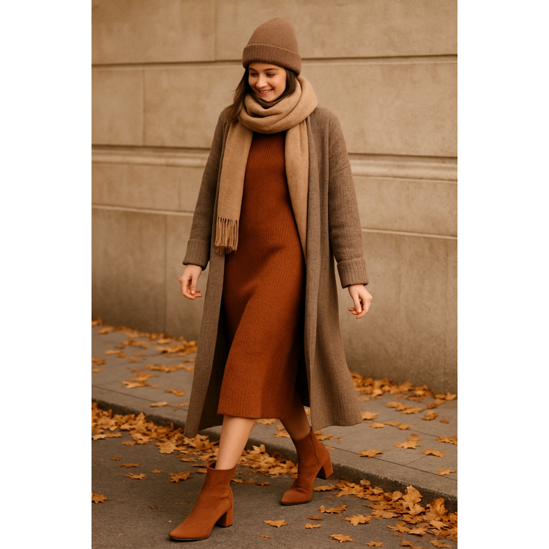 Az őszi pulóverruhák egy másik ruhadarab, amely fenomenálisan néz ki négyszögletes orrú bokacsizmával. Válasszon lazább, gyömbérbarna vagy mustáros árnyalatú modellt. Vegyünk fel vastag, hússzínű harisnyanadrágot vagy a ruhához illő árnyalatot. Adjon hozzá lapos vagy alacsony sarkú bokacsizmát. Egészítse ki a megjelenést egy hosszú kardigánnal és egy hozzáillő színű sapkával. Ez a ruha nem csak kényelmes, de rendkívül stílusos is, és az őszi trendekhez igazodik.