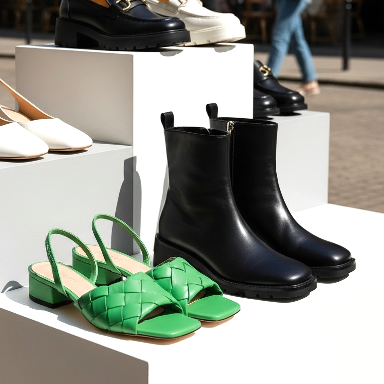 2026-ban ismét visszatért a négyszögletes lábujj, de ezúttal két különböző változatban. Az első egy erősen geometrikus, szinte merőleges lábujj-ék – merész, művészi, olyan divatházak által bemutatott, mint a Bottega Veneta. A második variáció az orr sarkainak finomabb lekerekítése – még mindig egyértelműen négyzet alakú, de nem annyira korlátozó. Mindkét változat tökéletesen megfelel a modern ruházati precizitás és építészet divatjának.