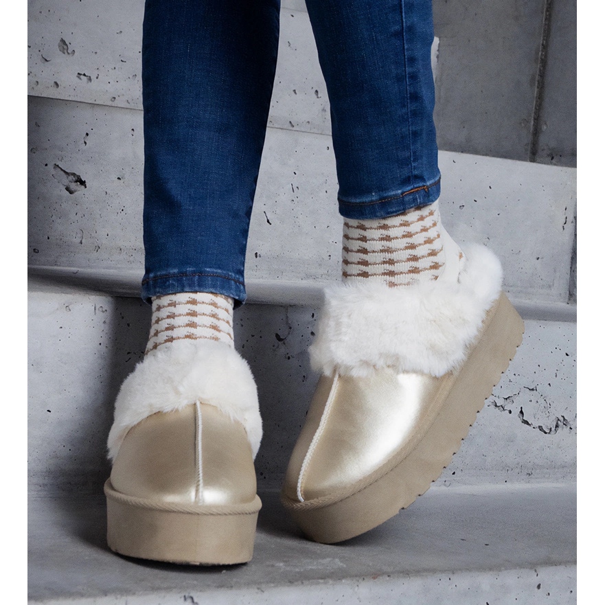 A szőrrel díszített arany papucs kiváló választás azoknak a nőknek, akik értékelik a stílust és a kényelmet. Ezek az innovatív cipők egyesítik az eleganciát és a kényelmet, ami ideális megoldást jelent a hűvös téli napokhoz. A kerek orruk finom és ugyanakkor modern megjelenést ad nekik, és a csúszó szerkezet könnyen felhelyezi és húzza őket.