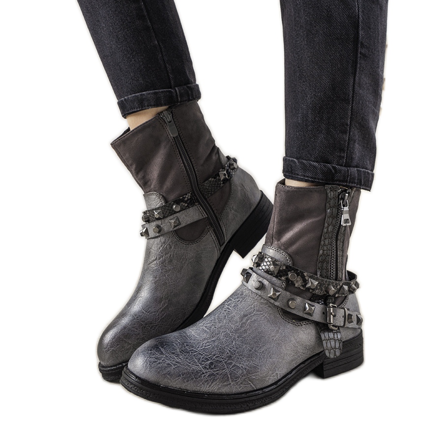Az elegáns női csizma egy szürke árnyékban egy kombináljon egy klasszikus, boka vágást egy sziklával, csapokkal díszített zenekarok formájában. Az ökológiai és az öko-eko-bőr kombinálásából készültek, és ezek nagyszerű kiegészítést jelentenek az őszi és a téli stilizációkhoz.