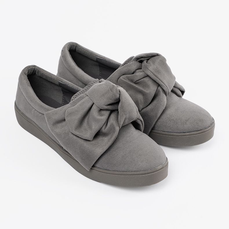 Ezt a modellt egy puha, beépített sarok és egy alacsony talpú műanyag futófelület különbözteti meg, amely kiváló tapadást és kényelmet biztosít. A finom íj miatt a cipők egyedi varázst szereznek, és a szürke szín miatt a különböző stílusok megegyeznek - mind alkalmi, mind elegánsabb.