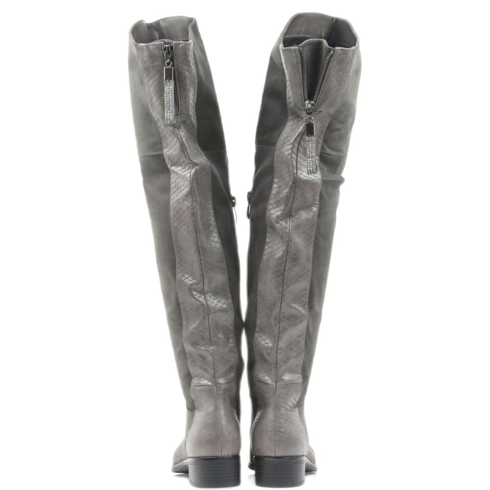 A Filippo 379 szürke színű, térd feletti csizma a tökéletes választás a stílust és a kényelmet értékelő nők számára. A kiváló minőségű velúr ökobőrből készült csizma elegáns megjelenésű és egyben funkcionális is. A felsőrész hátulját egyedi szintetikus betét díszíti, amely kígyópikkelyt imitál, karakteressé téve a lábbelit.