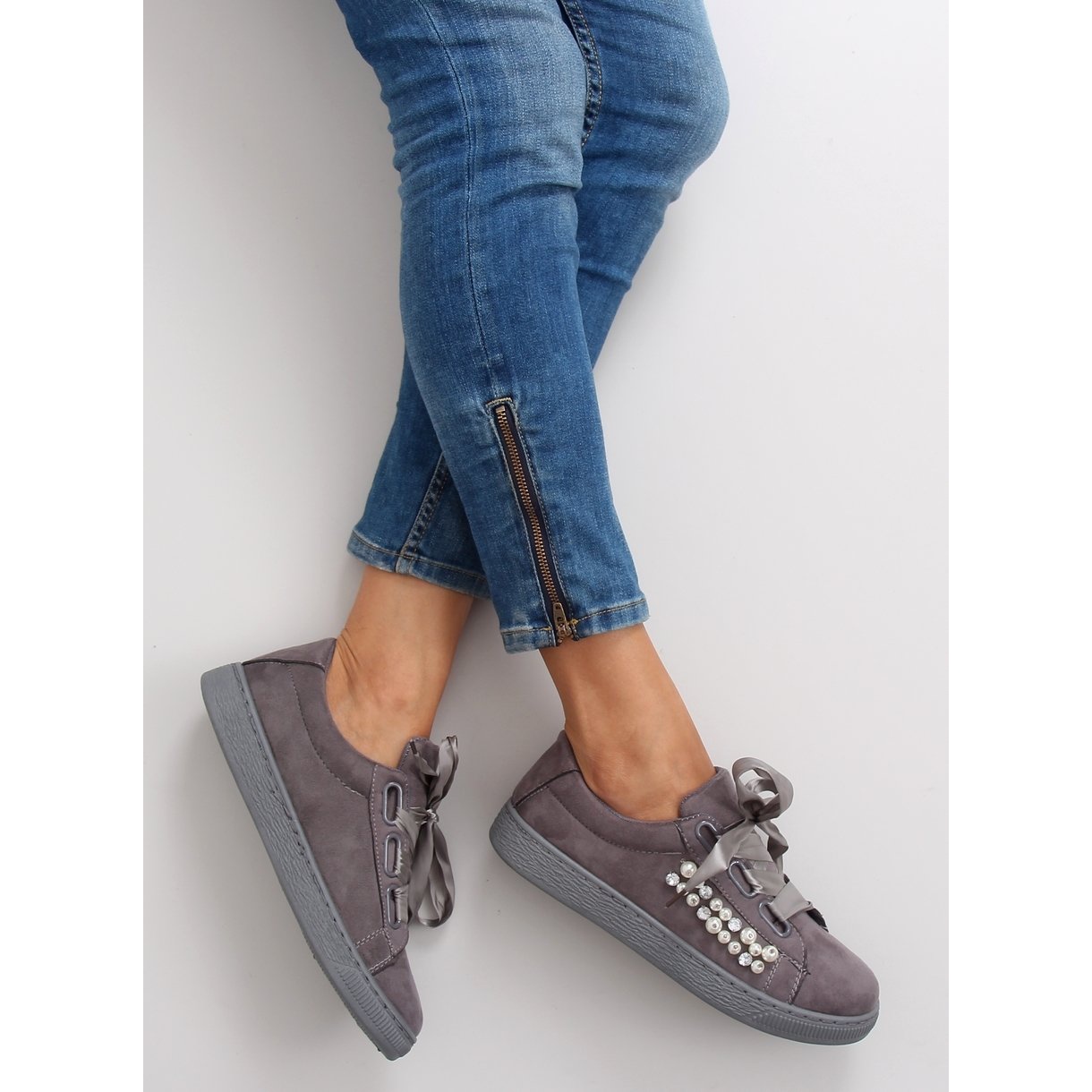 A Grey H99-11 Grey Sneakers gyöngyökkel egyedülálló női lábbeli, amely tökéletesen ötvözi a divatos dizájnt a viselési kényelemmel. Finom dekoráció jellemzi őket, amely romantikus karaktert kölcsönöz nekik - a hagyományos csipkék helyett elegáns szatén szalagot használnak, amely összhangban van a szezon legújabb trendjeivel.