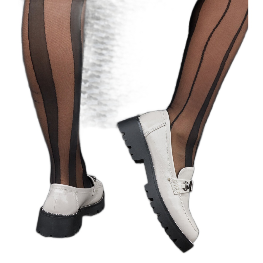 Stílusos, alacsony cipő, L. Greybe helyezve, amelyek kombinálják a kényelmet a finom ragyogással. Ökológiai bőrből készült, lakkozott kivitelben, dekoratív cirkonokkal, tökéletesen alkalmasak mind alkalmi, mind formálisabb stilizációkhoz. A természetes bőr talpbetét kényelmet nyújt, és egy gumi, a fekete talp garantálja a tapadást és a tartósságot.