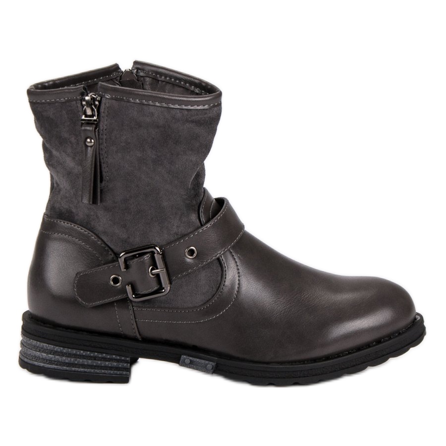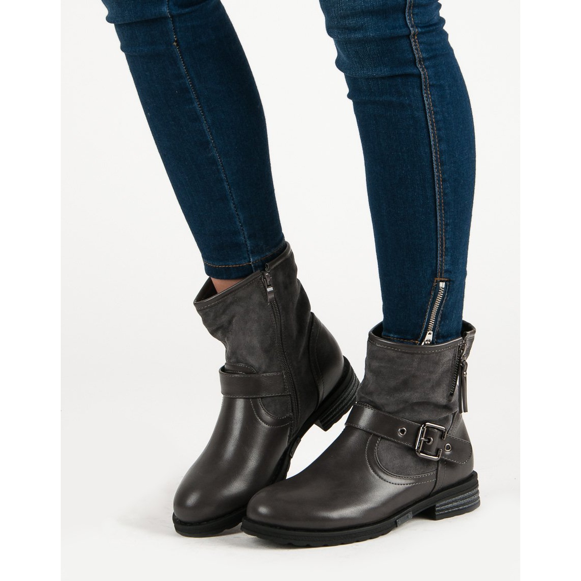 Kiváló minőségű szürke ökobőrből és környezetbarát velúrból készültek, ezek a dolgozók lenyűgözik elegáns, szikla dizájnjukat. A fémdíszek, köztük a szemet gyönyörködtető csat és a cipzár, egy csipetnyi avantgárdot adnak, így minden gardrób pótolhatatlan elemévé válnak. A vastag, taposott talp nemcsak kiváló tapadást, hanem kényelmet is biztosít hosszú séták során.