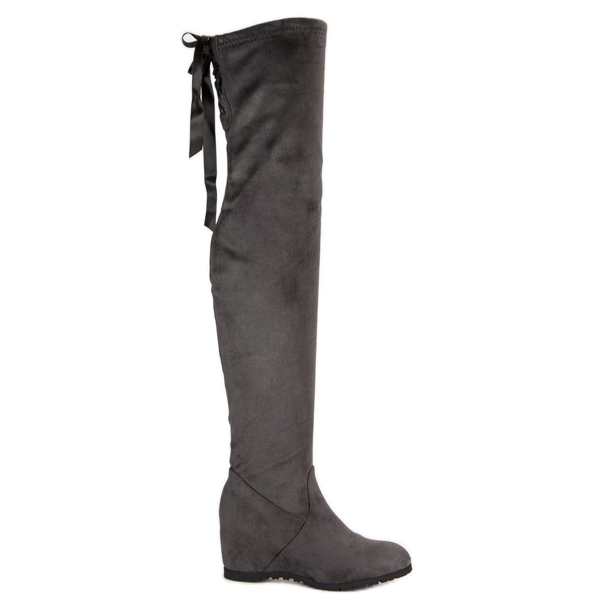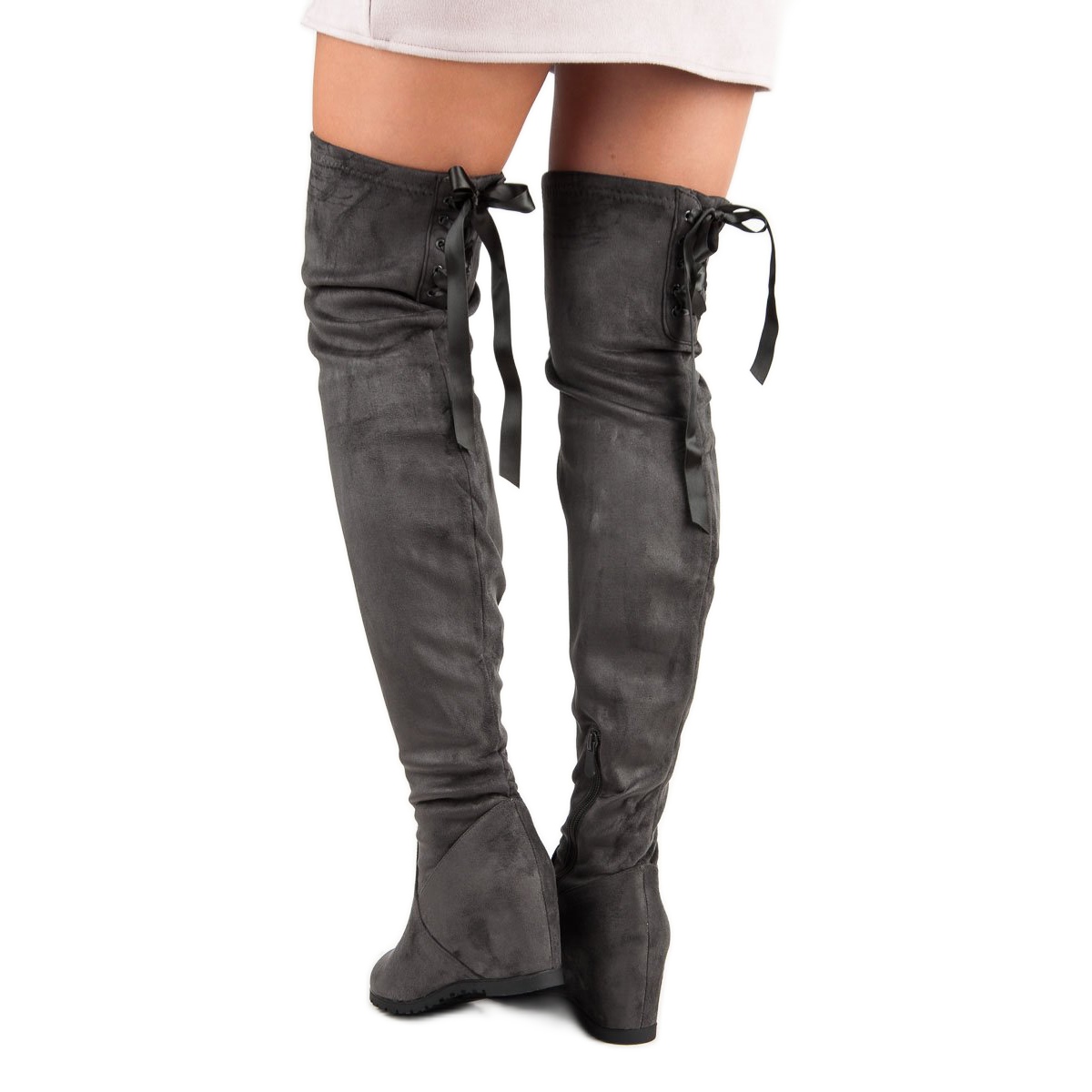 Az elegáns szürke árnyalatú, ökológiai velúrral díszített, térd feletti csizmák tökéletes kiegészítői bármely ruhatárnak. A magas, térd feletti felső nem csak karaktert ad, de hatékonyan véd a hideg ellen is. A rendkívül praktikus cipzár és fűzés tökéletes illeszkedést és könnyű felhelyezést tesz lehetővé.