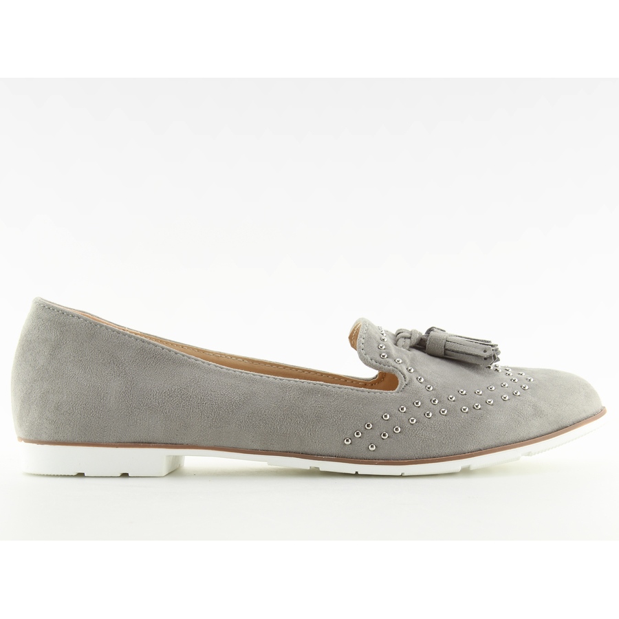Női szürke mokaszinok 22-05 Grey tökéletes választás minden nő számára, aki értékeli az eleganciát és a kényelmet. Elegáns, lordstílusú szabásuk nem csak divatossá, de rendkívül univerzálissá is teszi őket. Tökéletesen illeszkednek a klasszikus stílushoz, miközben eredetiséget adnak a finom ezüst strasszoknak köszönhetően, amelyek egyedi mintát alkotnak.
