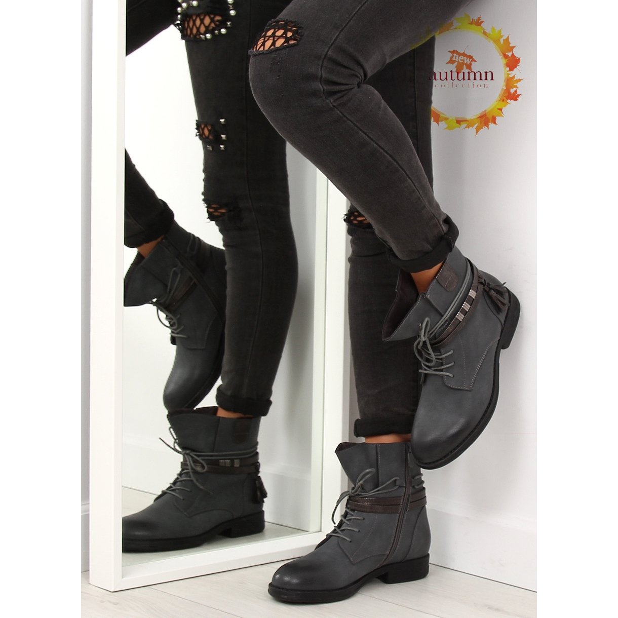 Ezek a cipők lapos talppal rendelkeznek, így ideális választás a mindennapi használatra. A bokát körbeölelő fémcsíkok divatos részlet, amely tovább hangsúlyozza stílusos megjelenését. A csizmák teljesen fűzősek, de a felsőrész oldalán található praktikus cipzárnak köszönhetően a felhelyezése gyors és kényelmes.