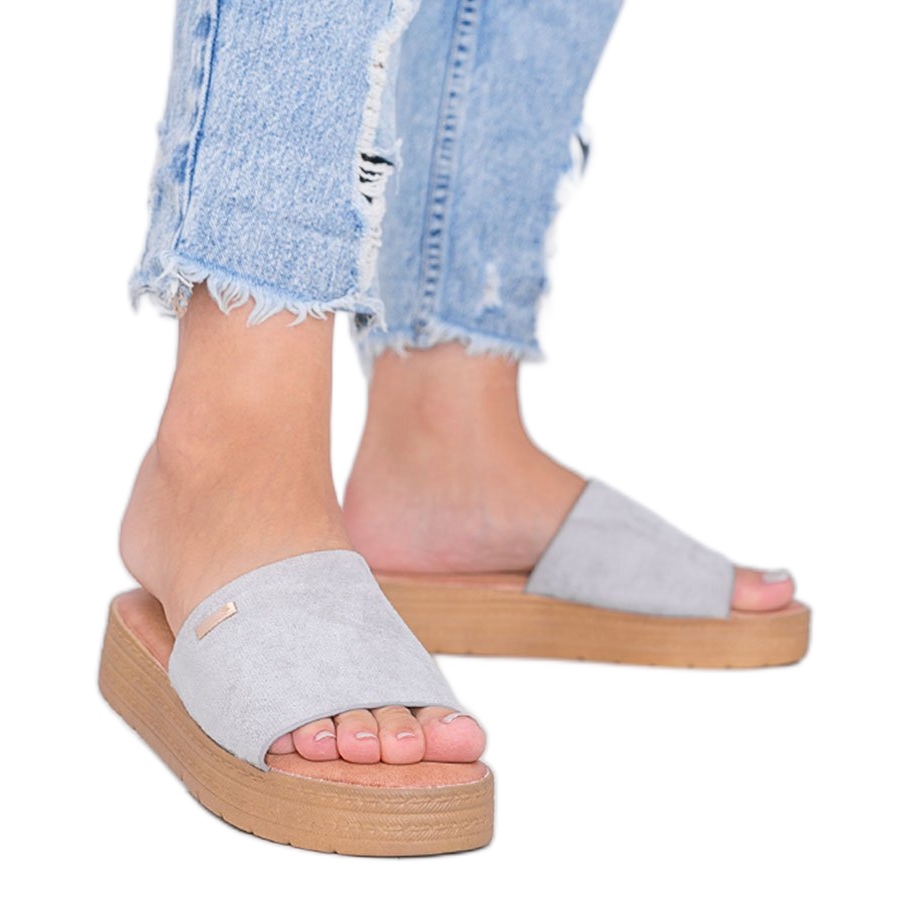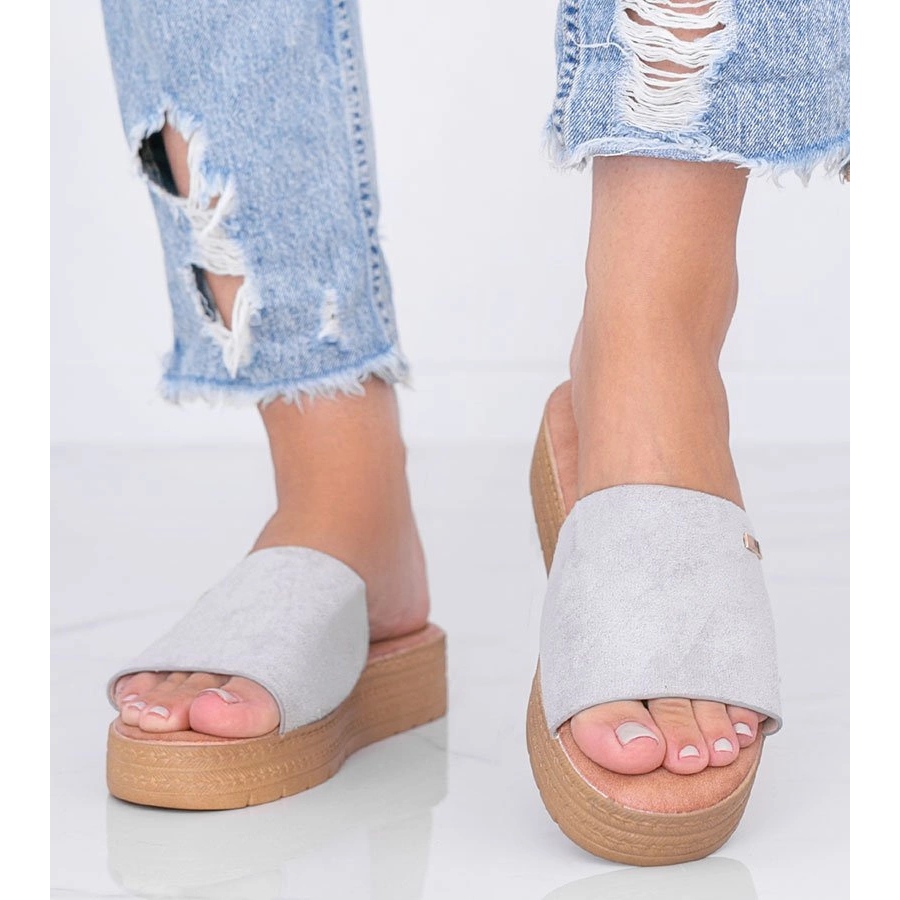 Divatos női papucs alkalmi karakterrel - ideális a mindennapi stílusokhoz. Vastag, 3,5 cm -es platformjuk van, amely modern megjelenést biztosít és biztosítja a stabilitást. A felső és a velúr ökológiai bőrből készült felső, a puha öko-bőr betét garantálja a kényelmet a nap folyamán. A bézs műanyag talp jól ellentétes a szürke felsővel. Kerek lábujj, mintázat nélkül - univerzális és könnyen kombinálható sok szekrény elemmel.