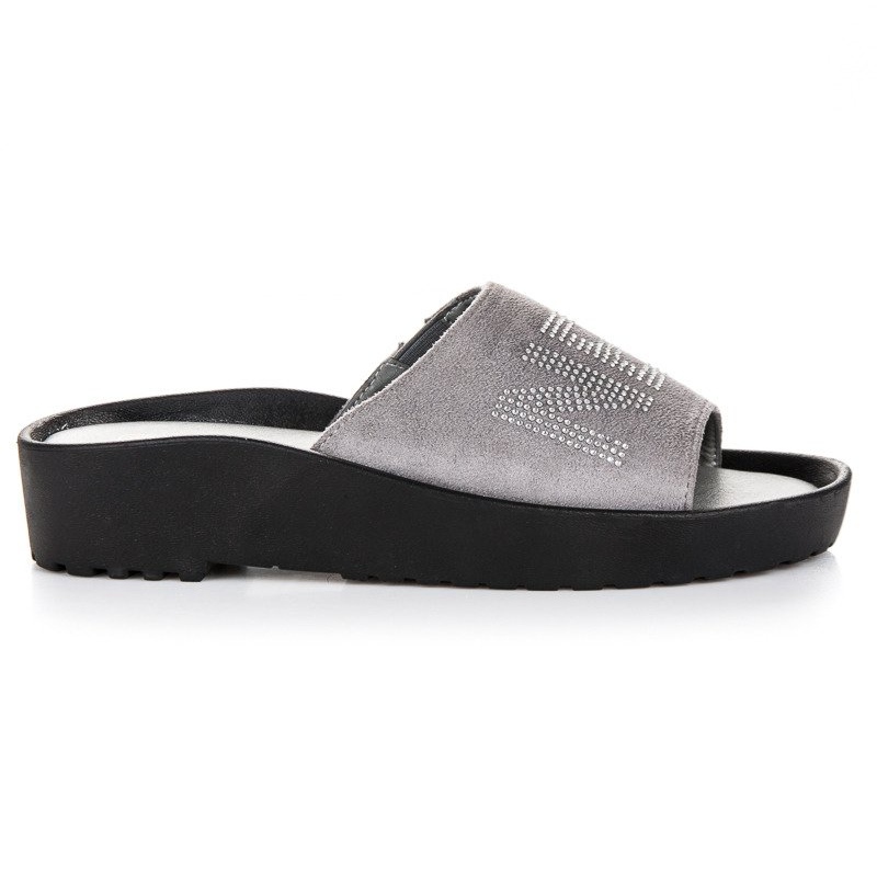 Fedezze fel az egyedi stílust és kényelmet a szürke velúr Vinceza csúszdákkal! Ezek az ökológiai velúrból készült elegáns papucsok a divatos esztétika és a praktikum tökéletes kombinációja. Szürke és ezüst színükkel tökéletesen passzolnak a különféle nyári stílusokhoz, finom varázst adva hozzájuk.