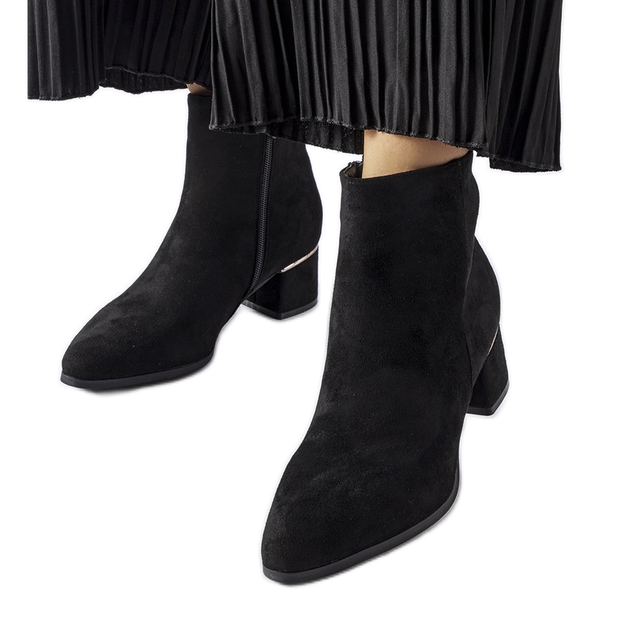 A klasszikus és a modern-tayyib csizma kötelező az őszi és téli szekrényben. Ökológiai bőrből készült, velúr kivitelben, időtlen fekete színű, jól illeszkednek mind a farmerhez, mind a ruhához vagy egy szoknyához. A hegyes orr kortárs karaktert ad nekik, és az oszlop alacsony magassága (5 cm) biztosítja a stabilitást és a kényelmet a nap folyamán.