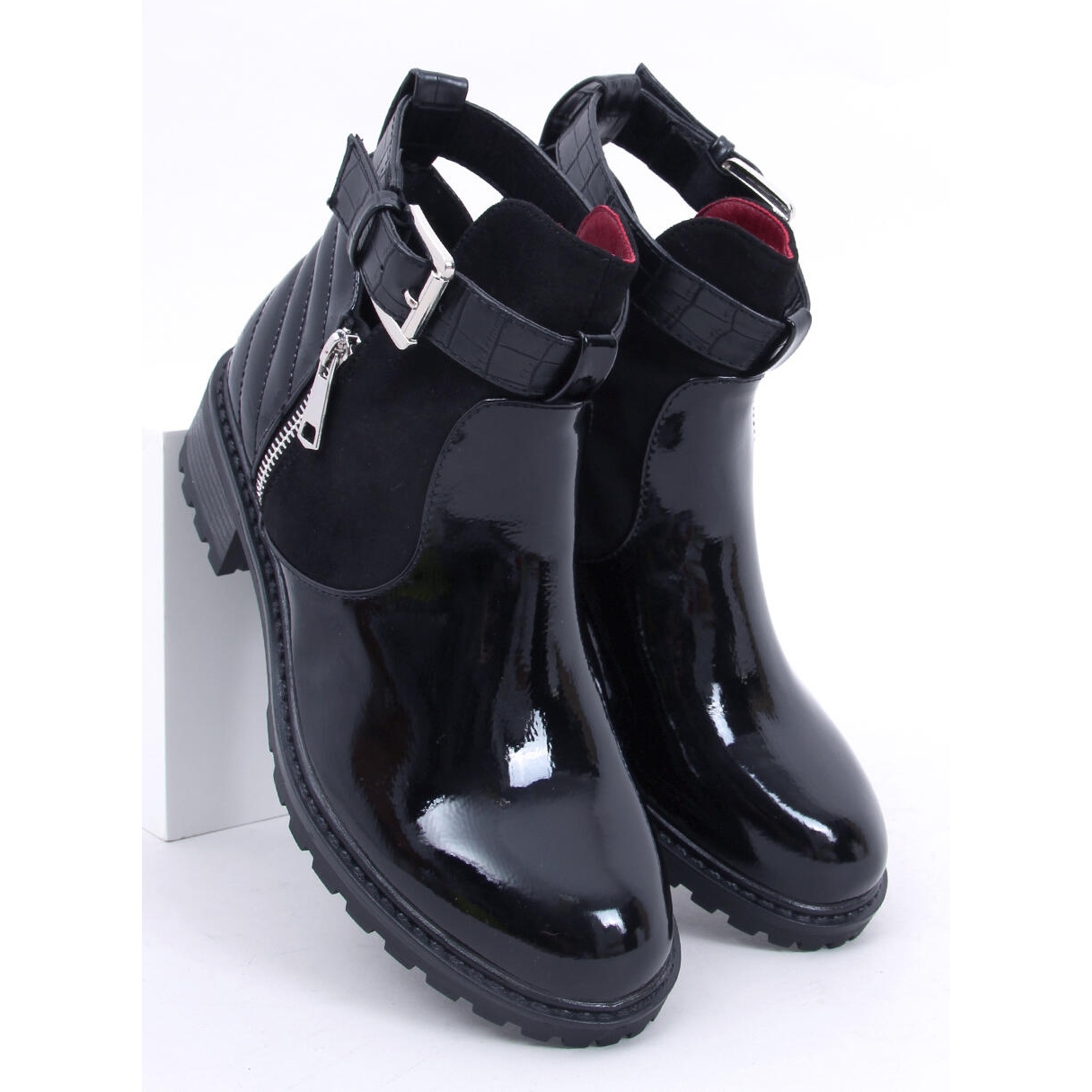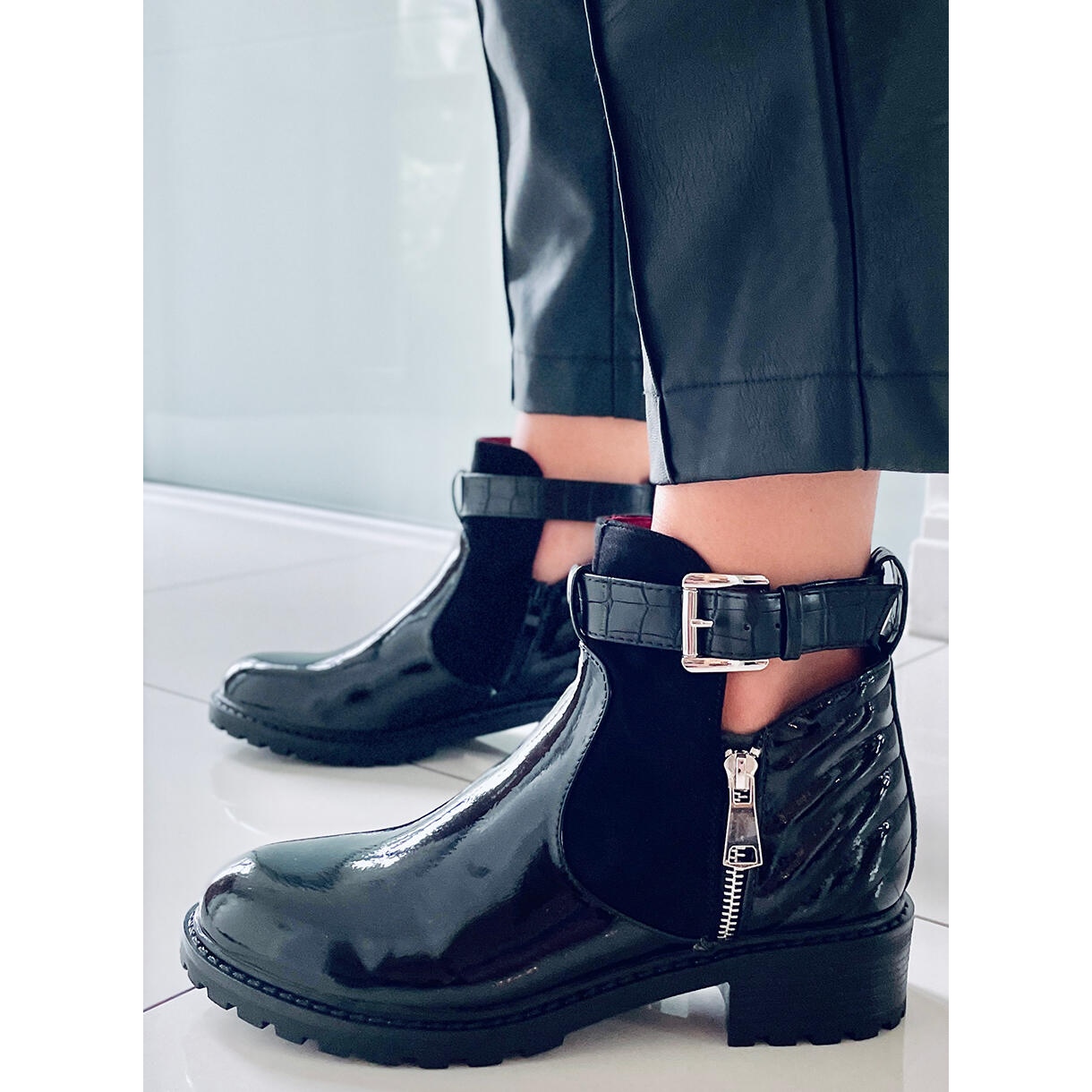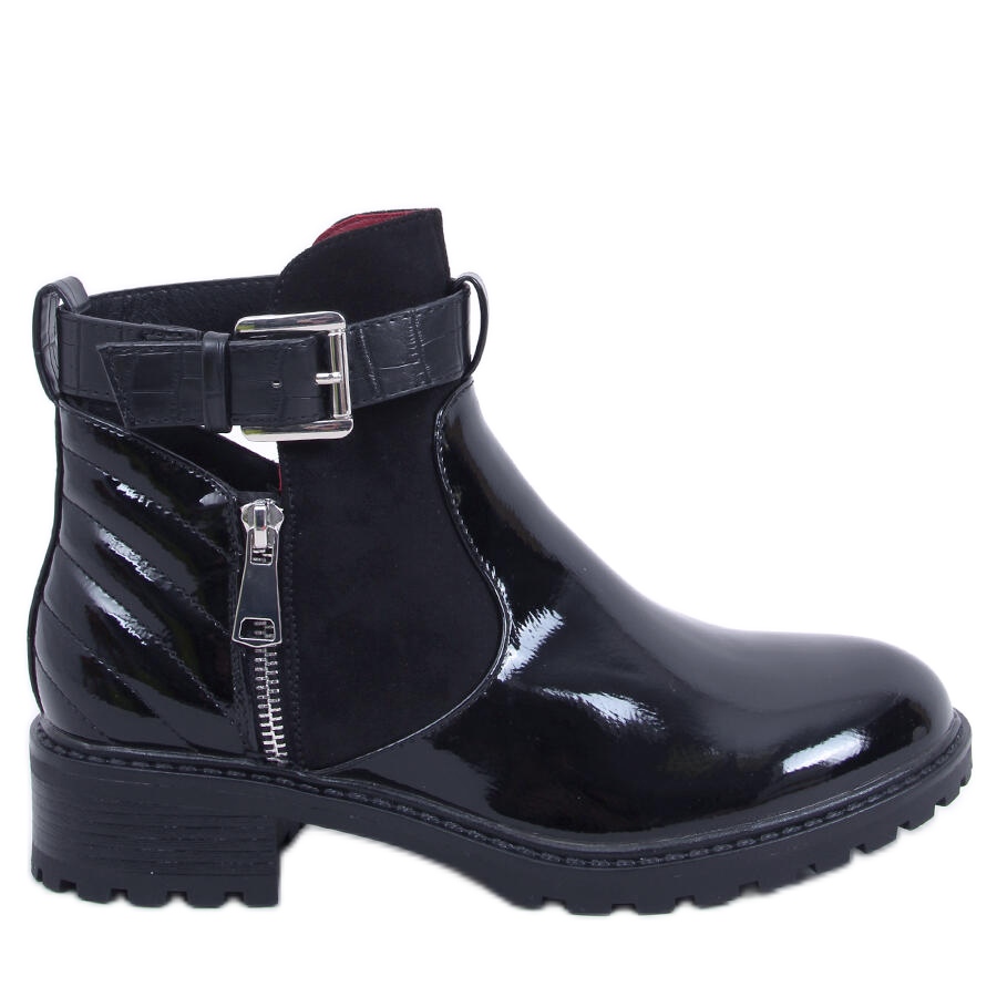 A csizmát lenyűgöző kivágások jellemzik a felsőrész oldalán, amelyek könnyedséget és stílust adnak. A dombornyomott és lakkbőrből készült betétek egyedülálló részlet, amely felkelti a figyelmet, és megkülönbözteti ezt a modellt a többitől. Kiváló minőségű ökológiai bőrből készült - teljes kiőrlésű, lakkbőr és velúr - garantálják a viselési kényelmet és a tartósságot.