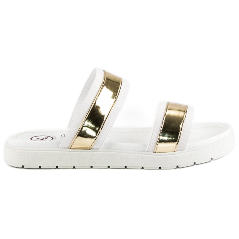 Két vastag, arany elemekkel díszített pánt nem csak vonzza a figyelmet, de stabil tartást is biztosít a lábon, így tökéletes választás a mindennapi használatra. A nyitott saroknak és a felcsúsztatható kialakításnak köszönhetően felhelyezésük gyors és intuitív, a futófelülettel ellátott gumitalp pedig tapadást garantál különféle felületeken.
